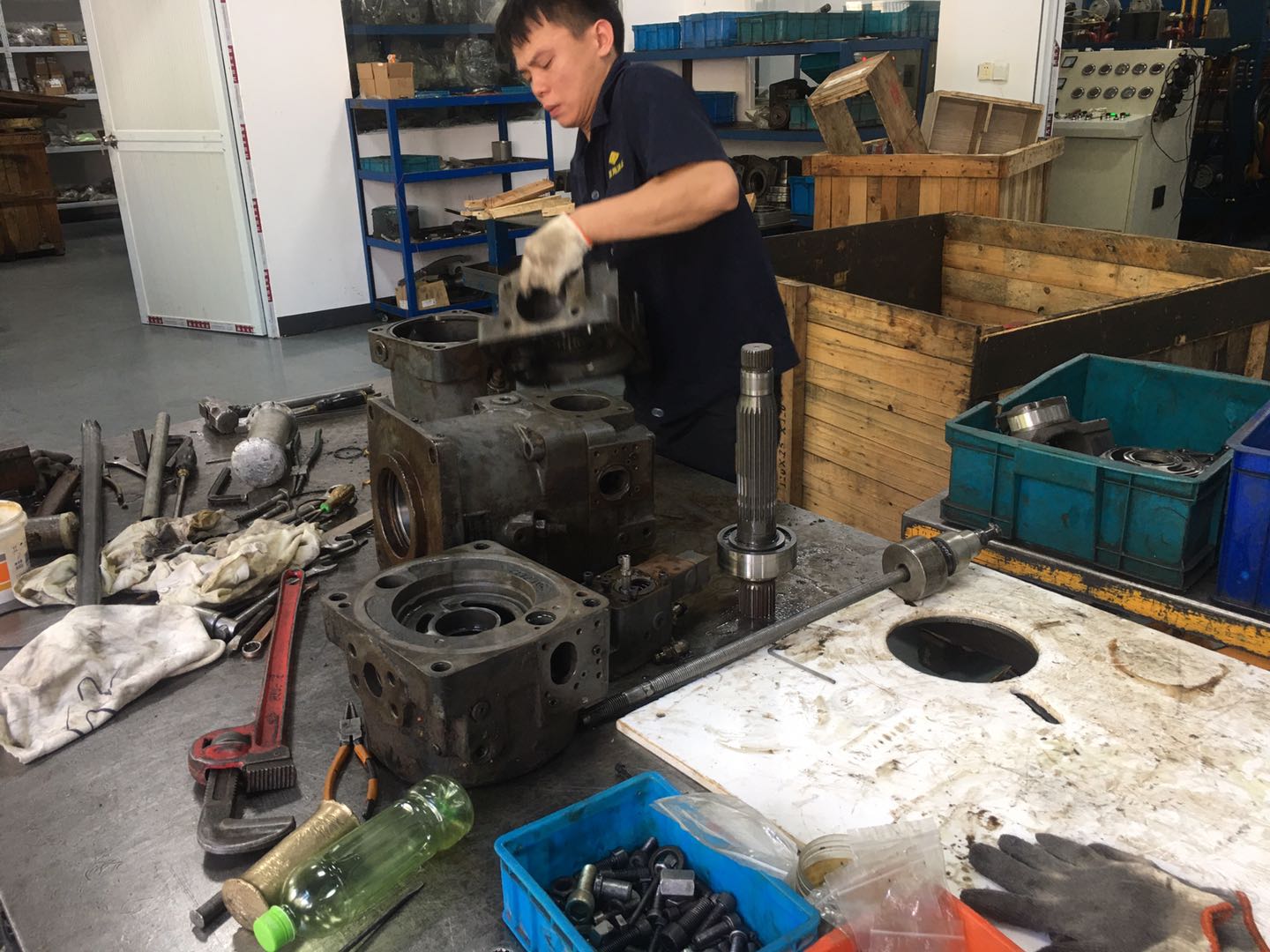 是往復(fù)泵的一種,屬于體積泵,其柱塞靠泵軸的偏心轉(zhuǎn)動驅(qū)動,往復(fù)運(yùn)動,其吸入和排出閥都是單向閥。當(dāng)柱塞外拉時,工作室內(nèi)壓力降低,出口閥關(guān)閉,低于進(jìn)口壓力時,進(jìn)口閥打開,液體進(jìn)入;柱塞內(nèi)推時,工作室壓力升高,進(jìn)口閥關(guān)閉,高于出口壓力時,出口閥打開,液體排出。帶滑靴結(jié)構(gòu)的軸向柱塞泵是使用*廣泛的軸向柱塞泵,安放在缸體中的柱塞通過滑靴與斜盤相接觸,當(dāng)傳動軸帶動缸體旋轉(zhuǎn)時,斜盤將柱塞從缸體中拉出或推回,完成吸排油過程。柱塞與缸孔組成的工作容腔中的油液通過配油盤分別與泵的吸、排油腔相通。變量機(jī)構(gòu)用來改變斜盤的傾角,通過調(diào)節(jié)斜盤的傾角可改變泵的排量。